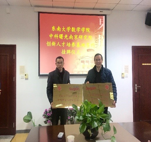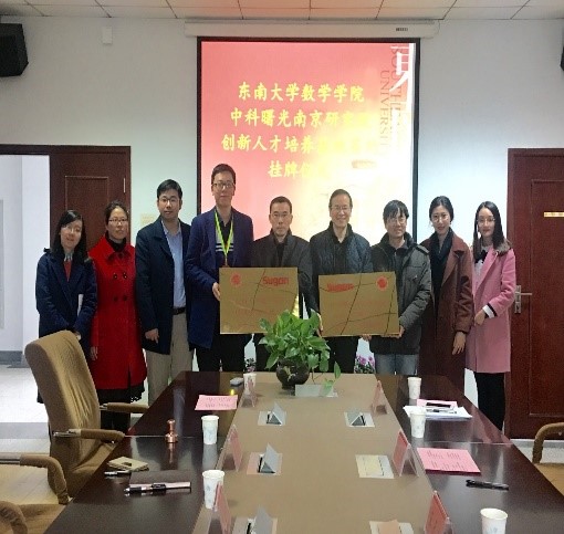 2017年12月28日上午,东南大学数学学院-中科曙光南京研究院创新人才培养基地签约挂牌仪式在东南大学数学学院504会议室顺利举行。中科曙光南京研究院有限公司副总裁兼大数据研发中心总经理王元兵、公司首席科学家黄程韦及相关人员和东南大学数学学院副院长李玉祥、应用数学系主任王小六、统计系副主任乔会杰及院团委书记蒋丽怡出席签约仪式。