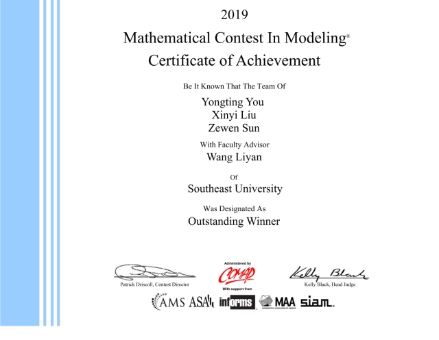 2019美国大学生数学建模竞赛成绩日前已经公布。在全体指导教师和参赛同学的共同努力下,我校今年再创辉煌,取得优异成绩,共获得特等奖一项,特等奖提名奖2项,一等奖23项,二等奖30项,获奖比例为45%,参赛成绩并列所有参赛学校的第5位。美国大学生数模竞赛是公认的最高水平的国际数模竞赛。2019美国大学生数模竞赛共有近2万6千队成功参赛,共评选出特等奖36项,特等奖提名奖43项,各占参赛总队数的0.15%,总的获奖率约为22%,其中一等奖约6%,二等奖约16%。在此热烈祝贺全体获奖同学,也衷心感谢学校及数学学院对数模竞赛工作的支持和关心,感谢各位指导老师的无私奉献。