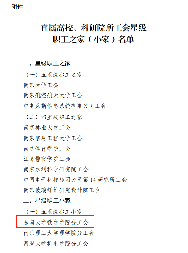 近日,江苏省教育科技工会下发《关于深入开展以会员评家为主要内容的“三互三评”活动情况通报》,我校数学学院工会荣评江苏省教育科技工会系统“五星级”职工小家。