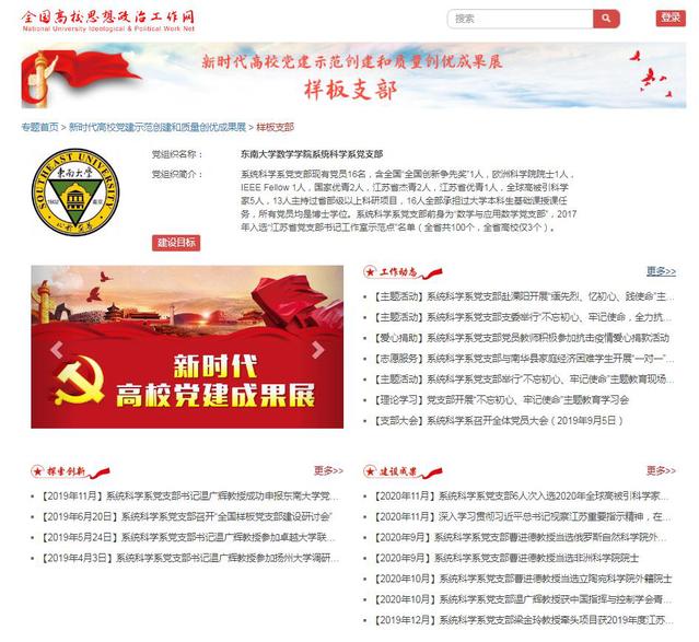 系统科学系党支部坚持立德树人,发挥榜样作用,引导党员教师不断挑战自我,在科研、教学、人才培养等方面取得不断突破。两年来,支部党员曹进德教授当选国际系统与控制科学院院士等五院院士,以肯定其在学术界的杰出贡献。支部党员曹进德教授、虞文武教授、温广辉教授、梁金玲教授、卢剑权教授5人(7人次)入选科睿唯安全球高被引科学家。2019年5月,支部党员虞文武教授获 “江苏青年五四奖章”,支部书记温广辉教授获“东南大学青年五四奖章”。2019年12月,支部书记温广辉教授获得亚太神经网络学会2019年度 apnns 青年研究奖。2019年东南大学数学学院成功申报江苏国家应用数学中心、江苏省信息数学应用中心,系统科学系党支部党员发挥了突出贡献。曹进德教授的论文获中国科协优秀科技论文、《中国科学》、《科学通报》优秀作者。这些成绩充分体现了数学学院系统科学系党支部成员在社会主义新时代撸起袖子加油干的奋斗决心和“双一流”建设中的积极作为和贡献。支部在数学学院官方网站和官方微信公众号均开辟了系统科学系党支部全国党建样板支部创建专栏,定期将创建工作动态、探索创新、建设成果等维护到网站,充分发挥多媒体、新媒体宣传载体,发挥典型示范作用,弘扬正能量。