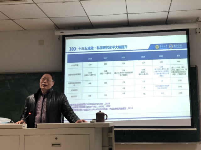 首先,院长曹进德汇报了学院“十三五”发展成效,学院在党的建设、思政工作、师资队伍建设、科研获奖、平台建设、学科建设、人才培养和文化建设等方面均取得显著成效,分析了“十三五”发展中存在的问题。同时他指出,“十四五”期间,数学学院将围绕我校到2035年左右跻身世界一流大学行列的奋斗目标,继承东大百年办学传统、借鉴世界一流大学成功经验,以建设一流师资队伍为突破口,坚持创新驱动发展,围绕国家重大战略需求,加强基础研究,注重原始创新,推进学科交叉融合,全面落实立德树人根本任务,,加快数学学院的内涵建设和整体提升,为东南大学世界一流大学建设进程做出应有的贡献。同时,曹院长汇报了学院2020年的工作,特别是学院第五轮学科评估的目标、优势与不足。