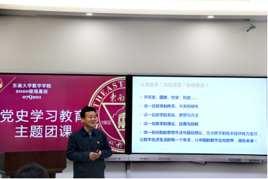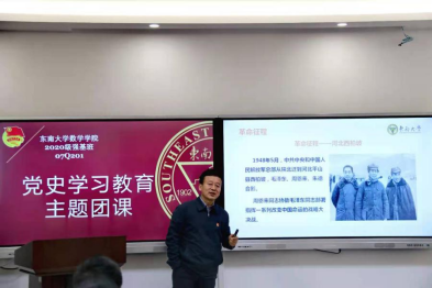 2021年4月8日下午四点,校党委副书记郑家茂教授受邀为所联系的数学学院2020级强基班团支部讲授“学习周恩来,一心为人民”的主题团课。数学学院党委副书记钟辉、团委书记蒋丽怡、辅导员姜岱玮以及2020级强基班同学和2019、2020级各团支部委员共同参加了本次主题团课。在齐唱东南大学校歌余韵中,强基班团支书李雨芝同学宣布团课正式开始。