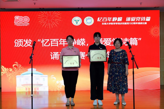 为纪念中国共产党成立100周年,深入贯彻落实习近平总书记在党史学习教育动员大会上的重要讲话精神,激励数学学院全体师生不忘初心、牢记使命,引领全院师生积蓄奋进力量,高质量开启“双一流”建设新征程。数学学院党委联合数学学院工会、数学学院团委于6月16日下午隆重举办了“忆百年峥嵘,诵爱党诗篇”东南大学数学学院庆祝建党100周年诵读比赛。