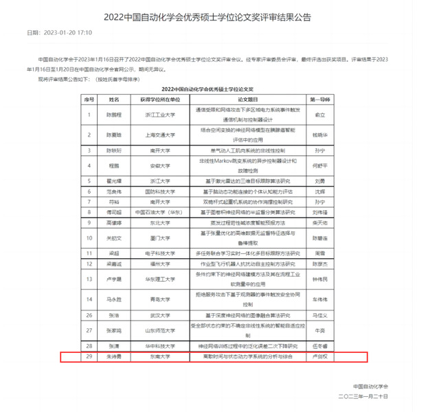 东南大学数学学院2021届硕士毕业生朱诗勇的学位论文《离散时间与状态动力学系统的分析与综合》(指导教师:卢剑权、曹进德)获2022年度中国自动化学会优秀硕士学位论文奖。