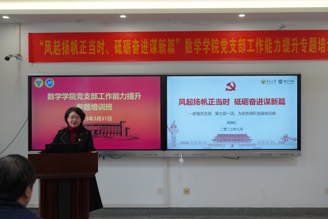 随后,数学学院党委书记吴映红作了题为《风起扬帆正当时、砥砺奋进谋新篇》。吴书记说,时代和任命赋予了我们神圣的使命,我们的身上承载着光荣的任务,我们要建强党支部,助力优势理科发展,聚焦双一流建设,要为早日实现建设中国特色世界一流大学的东大梦和中华民族伟大复兴的中国梦提供有力支撑。随后吴书记介绍了数学学院今年党委的工作计划,强调了高校党支部在党员教育、管理、监督以及发展中的作用,要求在“双一流”建设中,不断加强和改进基层党建,建强党支部,激发基层活力、凝聚强大的人才向心力和战斗力,同时对教师党支部、学生党支部支部如何抓好支委会自身建设、党员发展与教育管理服务、思想政治工作以及团结带领所在支部完成各项工作任务等方面提出了具体的要求。