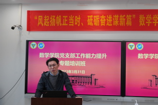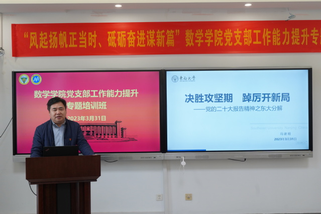 为进一步夯实学院各党支部党建工作基础,提升党支部工作的政治理论水平、业务素质和工作能力,2023年3月31日,党委委员、各党支部书记、委员及机关全体党员共同参加了数学学院党支部工作能力提升专题培训班,本次培训班特邀东南大学党委常委、政策研究室主任、党委统战部部长冯建明莅临作专题报告。