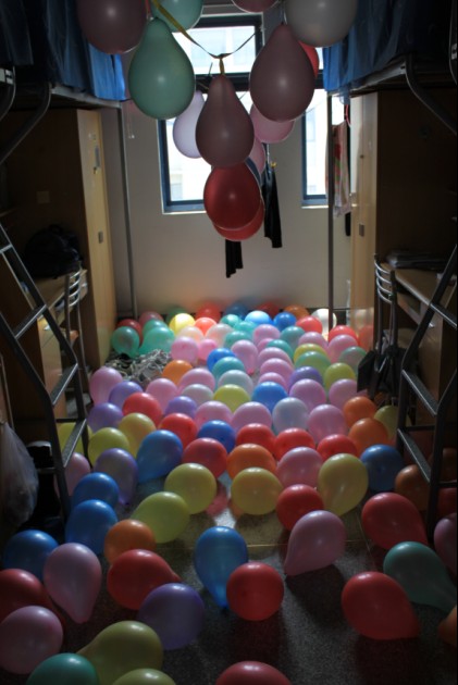 “交换矩阵”宿舍装扮大赛包括舍歌、舍旗、舍徽设计及宿舍交换装扮等多个丰富多彩的环节。经过一星期的准备,全系近30个宿舍报名参加了此次活动。4月23日和24日,周末的两天时间里,按照事先交换宿舍的方式,各宿舍利用有限的资源,来装饰被交换的宿舍。有的宿舍准备了窗花,有的准备了气球,也有的准备了各种精美图纸,手绘的,喷绘的,总之,各种饰物不胜枚举。被交换的宿舍有男女宿舍互换的,也有男生与男生、女生与女生宿舍之间互换,形式多样,效果出众。