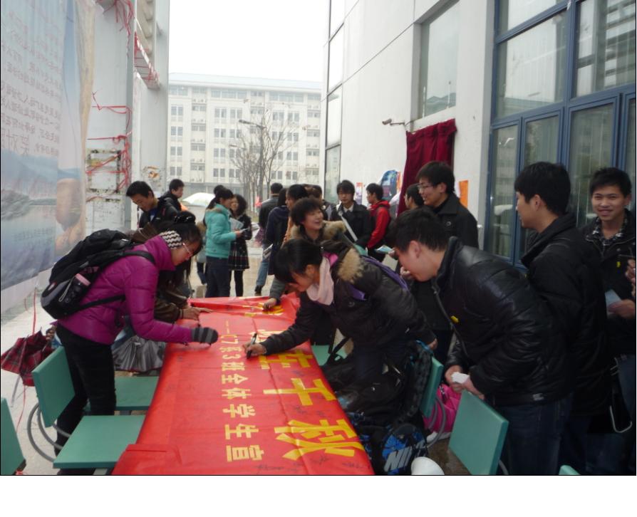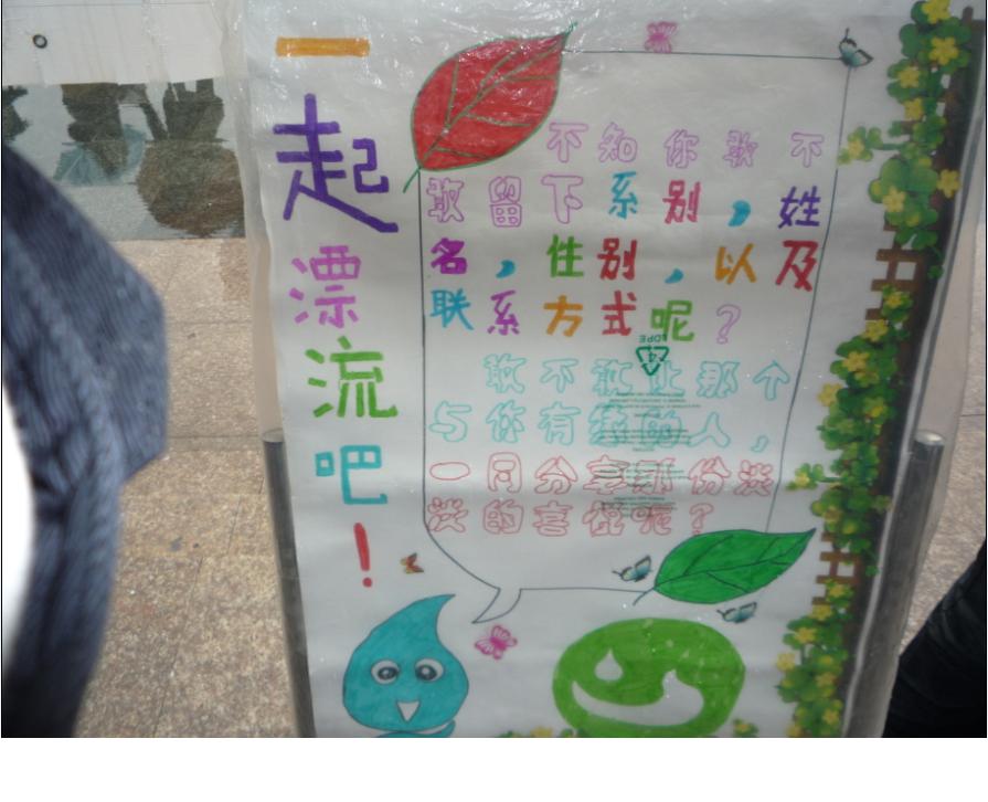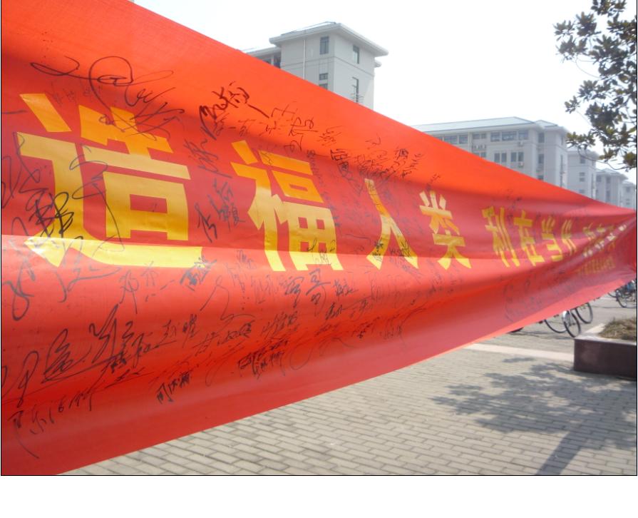 |     2010年3月22日中午,由数学系团委主办,数学系0701131团支部承办,以“爱惜生命之源,‘关’住点点滴滴”为主题的保护水资源宣传活动在我校梅园食堂顺利举行。此次活动不仅得到了学校领导、各位老师们大力支持和鼓励,也吸引了众多同学的积极参与。 本次宣传活动以“爱惜生命之源,‘关’住点点滴滴”为主题,由保护水资源横幅签名、图文展、节水心得漂流瓶三部分组成。活动当天阳光明媚,穿着校服的我支部工作人员青春洋溢,以饱满的热情向来往的师生们宣传水资源知识,提倡同学们保护水资源,并积极邀请他们参与到爱惜水资源的志愿活动中来。其间,近十米长的横幅格外耀眼,吸引了众多师生们的眼球。以其为基础的关爱水资源的签名活动得到了师生们的广泛参与,并纷纷留下了他们的签名。三百多个名字代表着三百多个承诺,三百多个名字代表着三百多颗关心灾区人民的心,大家都希望灾区人民能早日摆脱困境,重新过上幸福美好的生活。 除了横幅签名活动,本次活动还包括图文展和节水心得漂流瓶等环节。而节水心得则让同学们知道如何从小事做起,从身边做起,保护我们的水资源。欢声不断的漂流瓶活动不仅让同学们增加了对水资源的了解,更是让他们意识到保护水资源的重要性。我支部还在本次活动中派发了两百张关于保护水资源的宣传单。 本次宣传活动是0701131团支部在中国西南大干旱的背景下,以3月22日“世界水日”为契机,结合当今国内外的实际情况和具体形势,爱护环境的宗旨而举行的“爱惜生命之源,‘关’住点点滴滴”活动。我支部希望通过此次活动,在西南地区遭受大旱之际,打响我校区支援西南干旱、保护水资源的“第一枪”,引起校区师生们对西南灾区的关注,并借此为我校区营造一种“人人节约水资源,人人保护水资源”的氛围,提高校区师生们保护水资源的意识。  |