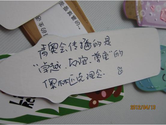 |     2012年4月13日中午,由数学系团委主办、数学系070111团支部承办的,为迎接2014年第二届青奥会,以“活力东南,共迎青奥”为主题的系列活动在我校梅园食堂顺利开幕。此次活动不仅得到了学校领导、各位老师们大力支持和鼓励,也吸引了众多同学的积极参与。     本次“活力青奥”作为“活力东南,共迎青奥”系列团日活动的第一个系列,由走进青奥、活力青奥和祝愿青奥三部分组成。虽然活动当天天公并不作美,但我支部工作人员热情不减,全都以饱满的热情和积极的态度投入到本次团日活动中。    其间,趣味飞镖的娱乐环节吸引了众多师生的眼球。大家纷纷参与其中,一展身手,赢取精美小奖品。此环节中涌现出的高手、牛人们,引起围观群众的尖叫和掌声,将本次活动推向了高潮。我支部希望通过本环节传达出“运动快乐”的理念,让大家在简单的小运动中感受运动之美、运动之乐。    此外,本次活动还包括分发青奥知识卡和书写对青奥的祝愿两个环节。我支部成员将与青奥有关的常识写在卡片上,并分发给同学们,希望借此普及青奥知识,让同学们进一步地感受青奥。书写祝愿便笺环节将本次活动再次推向了一个高潮。看着围在桌旁的拥挤人群,读着同学们亲笔写下的祝福,我们深深感受到了东大学子对青奥的关注与期待。     本次团日活动是我070111支部为迎接2014年将在南京举行的第二届青少年奥林匹克运动会,结合我校学生的实际情况,以提倡在运动中感受快乐为理念而举办的活动。我支部希望通过本次活动,在普及青奥知识,增加同学们对青奥会的了解的同时提高同学们运动健身的热情。  |