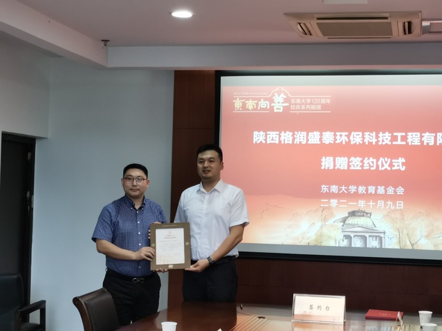 正值东南大学数学学科创建100周年之际,数学学院校友、陕西格润盛泰环保科技工程有限公司总经理费佰洋向学校捐赠100万元。捐赠仪式于2021年10月9日在东南大学九龙湖校区行政楼224会议室举行。陕西格润盛泰环保科技工程有限公司总经理、副总经理郑浩、总经理办公室主任江航等一行嘉宾,东南大学副校长、教育基金会常务副理事长黄大卫,数学学院党委书记吴映红,法学院党委书记毛惠西,发展委员会副主任、教育基金会秘书长芮振华,数学学院党委副书记钟辉,副院长王小六,法学院教授高歌等出席了仪式。仪式由毛惠西书记主持。