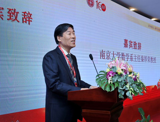 随后,南京大学数学系主任秦厚荣教授发表致辞。秦厚荣代表南京大学数学系对东南大学数学同仁表示热烈祝贺。他表示南京大学和东南大学同根同源、亲如兄弟,双方老师在学科建设、科学研究、人才培养、社会服务等方面都有非常紧密的合作与交流。南京大学数学系与东南大学数学学院素有渊源,培养出了一批学术精英和业界翘楚。他希望两校数学学院进一步加强交流与合作,同心同德、携手并进,为推进新时代数学学科的发展,为实现数学强国之路作出更大的贡献。