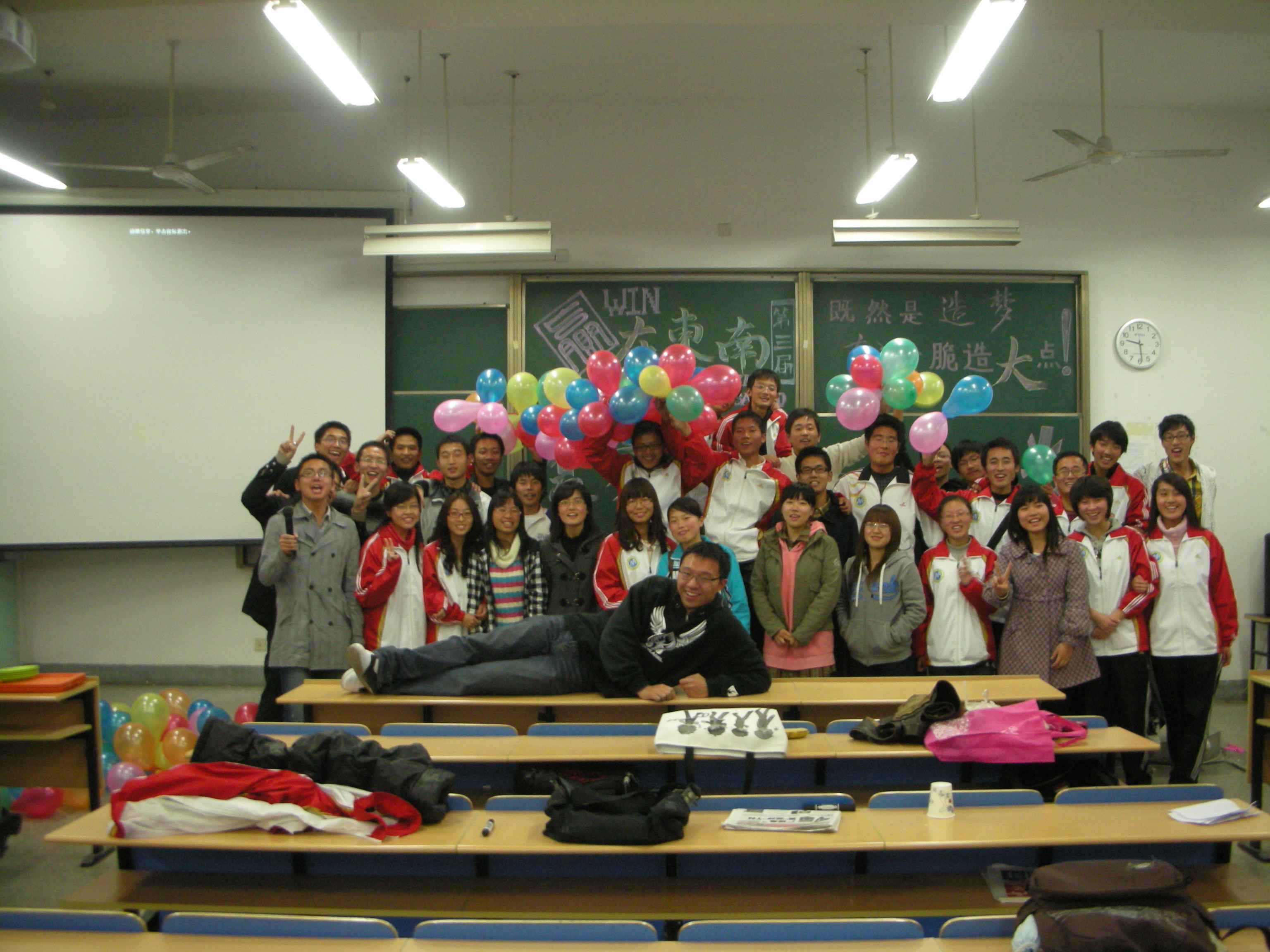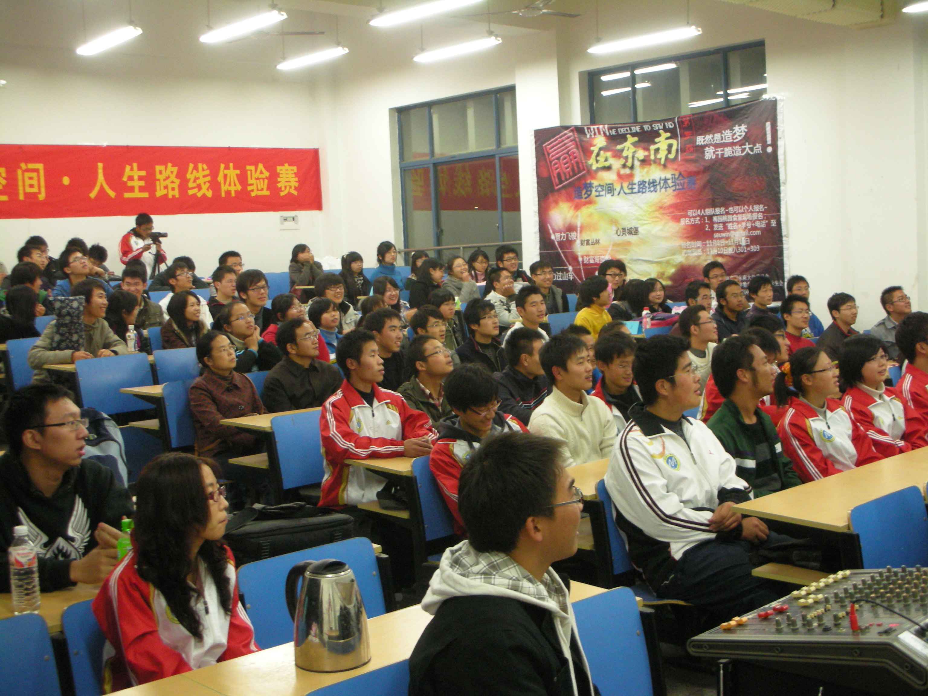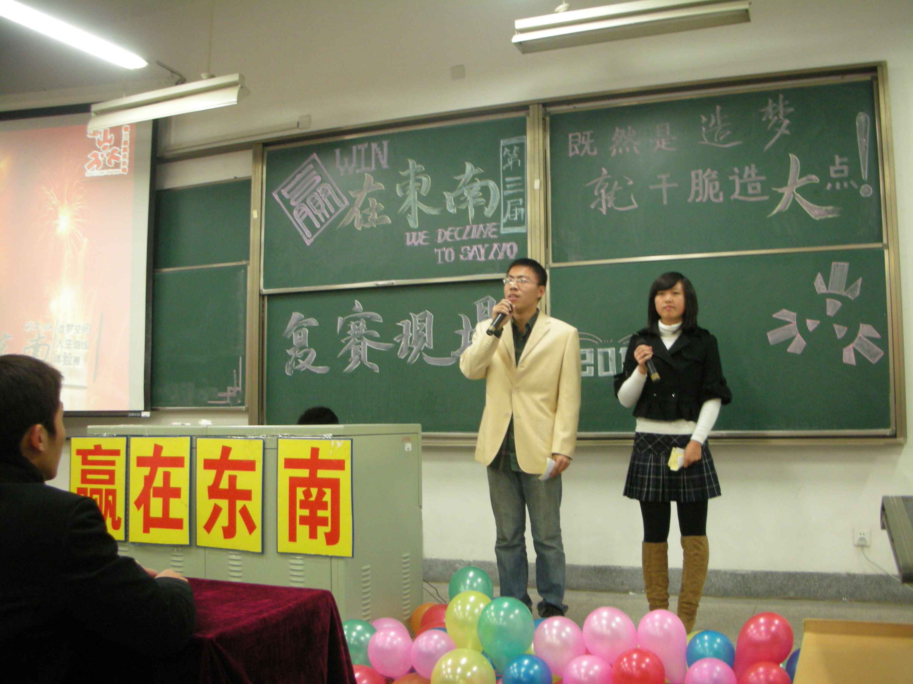 第三届“赢在东南”造梦空间。人生路线体验赛复赛于11月27日晚19点在教4-202进行,参赛队员精彩的展示、啦啦队热情的助威,整个复赛现场气氛热烈、激情洋溢。 复赛由“心灵碰碰车”“财富海盗船”以及“团队展示”三个环节构成,分别从智慧、情感、财富三个方面考察选手能力。 在主持人轻松地主持氛围中,复赛拉开帷幕。7支队伍分别展示了他们精心制作的视频,包含了“智力过山车”环节队员制作鸡蛋保护装置的齐心协力,还有 “财富海盗船” 环节在市区玫瑰花换物行动的精彩片段,记录了他们在各个环节的点点滴滴。“团队展示”环节,参赛队伍采取不同的方式为大家呈现最好的自己,有的是搞笑视频,有的模拟娱乐新闻。主持人诙谐幽默的提问,队员极具个性的回答,将气氛推向了高潮。其中,来自经管学院的一3一4代表队的舞蹈和来自机械学院chris.k队员表演的用电脑键盘演奏弹钢琴更是为比赛添光添彩。 最终,根据7支队伍在复赛三个环节的表现,经评委打分,来自数学系的x-ray,机械学院的chris.k,仪科学院和交通学院的馒头成功闯入决赛,继续迎接新一轮的挑战。决赛仍然从智慧、情感和财富方面展开,究竟选手们会有怎样的表现,谁又是最终的赢家,敬请期待!  |