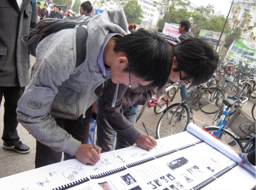 11月24日,正值感恩节。数学系感恩在行动活动分为两部分同时开展。桃园食堂门口摆开的是同学们精心为母校准备的礼物――东大历史的演变画卷,号召大家签名留念感恩。画卷是由一张张由黑白到彩色,从校徽、校章到文化建筑的图片组成,我们在诉说东大人自己的故事。活动中,同学们踊跃参与,并向工作人员询问各种细节。我们用相机记录了他们的微笑,同时也感受到了他们话语中流露的自豪。感恩东大,感恩母校,这长长的画卷是我们在东大110周岁生日到来之际献上的小小礼物。