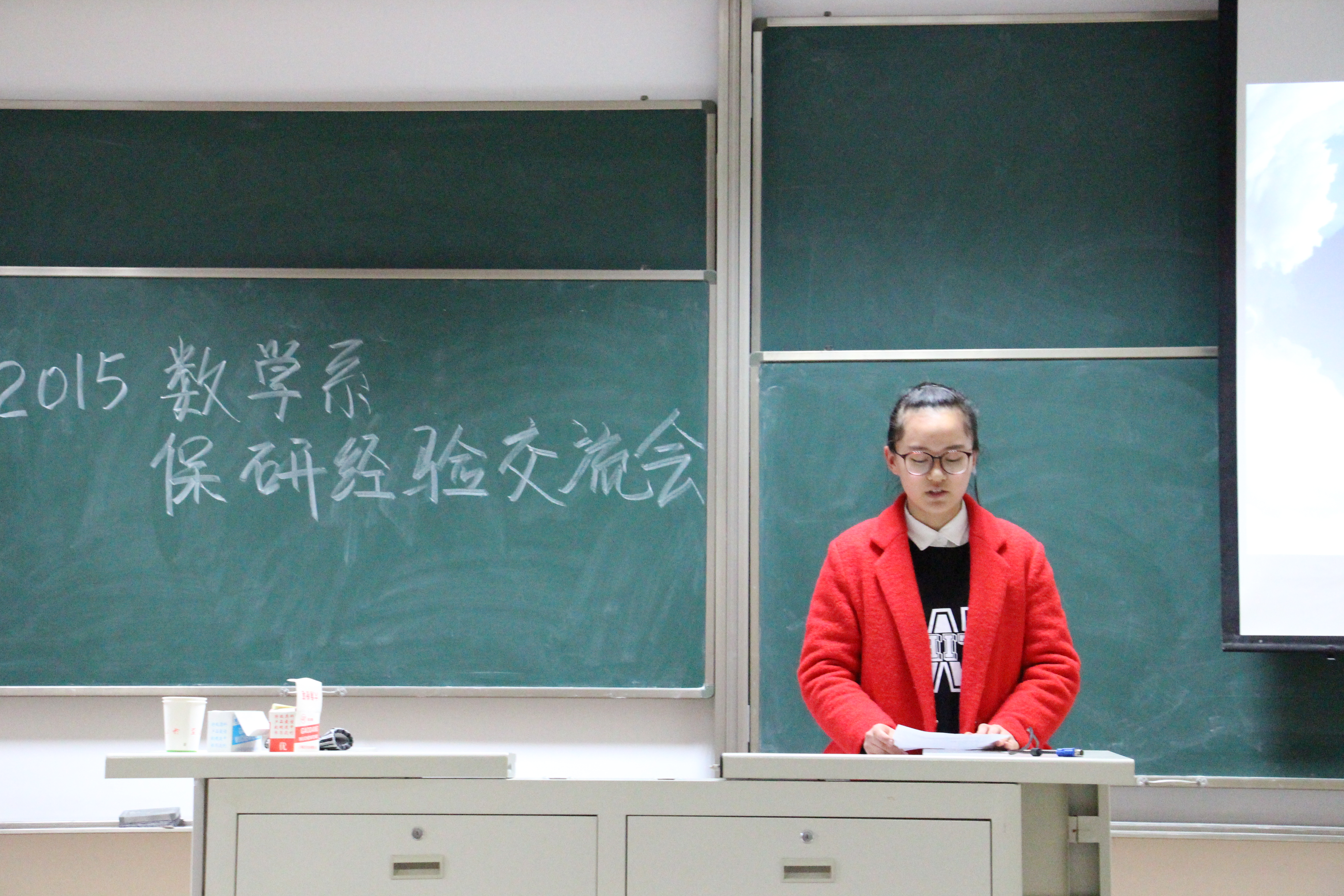 最先介绍的是免研至中科院数学与系统科学学院系统理论方向的潘冯超同学,他分享了免研考试的一些细节。刘国成同学免研到东大交院,他强调了明确目标的重要性,同时也分享了一些他所了解的项目。免研至东大数学复杂网络与复杂系统的刘洪�学长则幽默地讲解了一些面试的小技巧,首先是要保持微笑,第二点是别说不会,一步一步就完成一道你并“不会”的题。免研至北航信科的许卓颐同学以自身的例子说明了确定目标的重要性,另外强调一定要广投夏令营,包括那些特别好的学校也要投,万一中了呢?免研至东大经管的万佳�同学给大家讲了一个“学弱”的自我忏悔录,讲了免研考试的构造。同时她还给大家说明了去保研是因为意识到自身不足,希望继续学习提高自己,大家不要盲目跟风。免研至东大数学统计学的梁晓洁同学强调说想保外的一定要早关注各个高校的夏令营,如果绩点卡在保研边缘的,要有两手准备。她还给大家分享了一个保研论坛,想保校外的同学在拿到推免后要立即联系校外老师。免研至复旦大学数学与科学学院基础数学专业的金臻涛学长说明了以下三点的重要性:一是要掌握充分信息,关注保研论;二是要全面的学习和针对性的复习;三是要调整心态。免研至复旦大学数学与科学学院应用统计专业的温雅静同学给大家全面详细地分享了保研的流程、专硕和学硕的区别以及很多有用的资料。免研至东大经管学院产业经济学的王莹学姐分享了她在南开经管学院夏令营的经历,包括论文答辩时的一些需要注意的地方。免研至东大统计学的丁嘉沼学长提出了获取信息以及明确目标,他送给大家一句话“保研成功与否,结果理想与否,或许只是一个开始”。免研至东大数学复杂网络与复杂系统的田方正学长向我们推荐了南大的保研夏令营,谈到了保研考试需要准备的相应课程包括数分,高代,复变,实变等。免研至东大自动化专业的张向向学长则告诉我们提前联系导师的重要性,不然可能会错过许多机会。