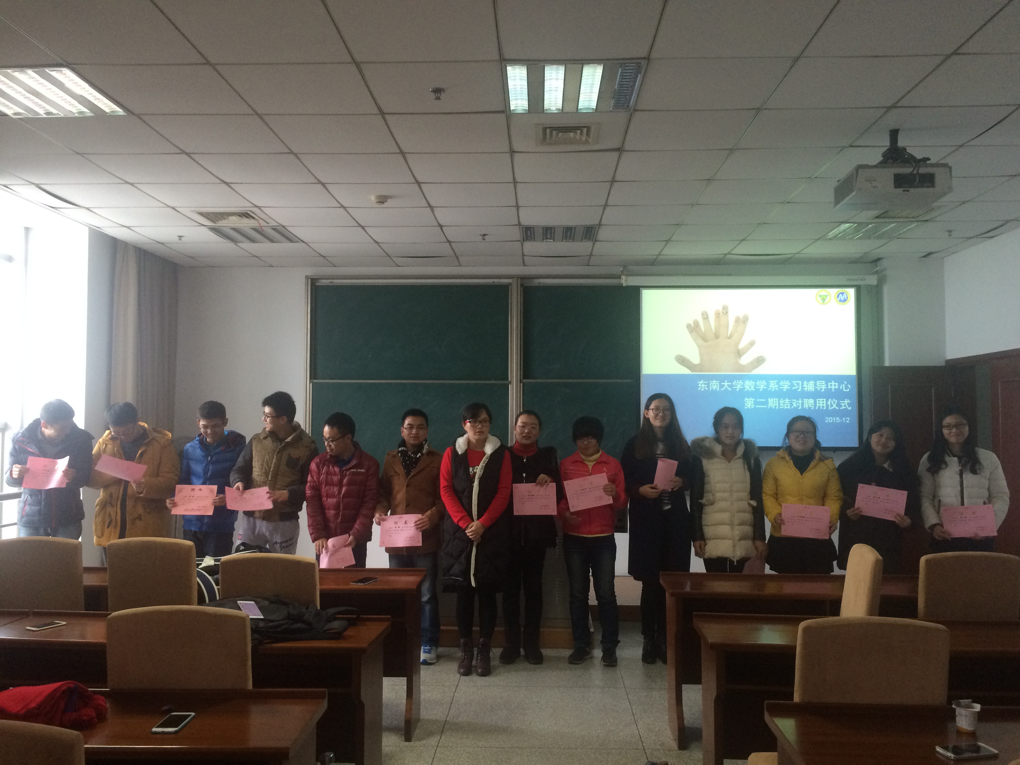 为了更好地促进我系2013级的学风建设,更好地架起学霸与学弱之间学习与情感的桥梁,数学系学习辅导中心第二期结对仪式于2015年12月24日圆满举行。数学系党委副书记曹海燕老师出席结对仪式,系团委书记、本科生第一党支部书记袁煜昶老师为13位辅导讲师颁发聘书和工作牌。 活动自今年12月正式启动,由数学系本科生第一党支部承办。期中考试以后,结合部分学生专业课成绩不是太理想的现状,正式启动了学习辅导中心第二期工程。在经过一段时间关于辅导讲师和学员的招募后,成功建立起“学优生―学困生”一助一的帮扶关系,打造“督学、助学、乐学”的帮扶平台,让每位同学都能学有所长,学有所用。 12月24日中午12时,数学系第一报告厅,学习辅导中心第二期结对仪式正式开始。会上,袁煜昶老师宣读了辅导讲师职责与学员职责,强调了辅导讲师对学员主要以陪同自习的形式开展辅导,通过自己身体力行的学习状态和方法促使学员探寻适合自己的学习方式,并确保在每次辅导过程中可以有耐心、有责任心地解答学员提出的各类相关课业问题。同时,袁老师也对大家提出了几点希望,辅导讲师应该对被帮扶同学的现状有深入的了解,对症指导;被帮扶的同学则应端正学习态度,直视自己的问题,勇于接受辅导讲师的帮助。 最后,袁煜昶老师为13名辅导讲师佩戴了工作牌,并颁发聘书。这是对辅导讲师工作职责的认可,更是一种激励,希望辅导讲师们能够担起这一职位所赋予的责任,用心、细心、耐心地完成这一任务。也希望通过我系学习辅导中心的共同努力,可以实现讲师与学员的共同进步与共同成长。(袁煜昶)  |