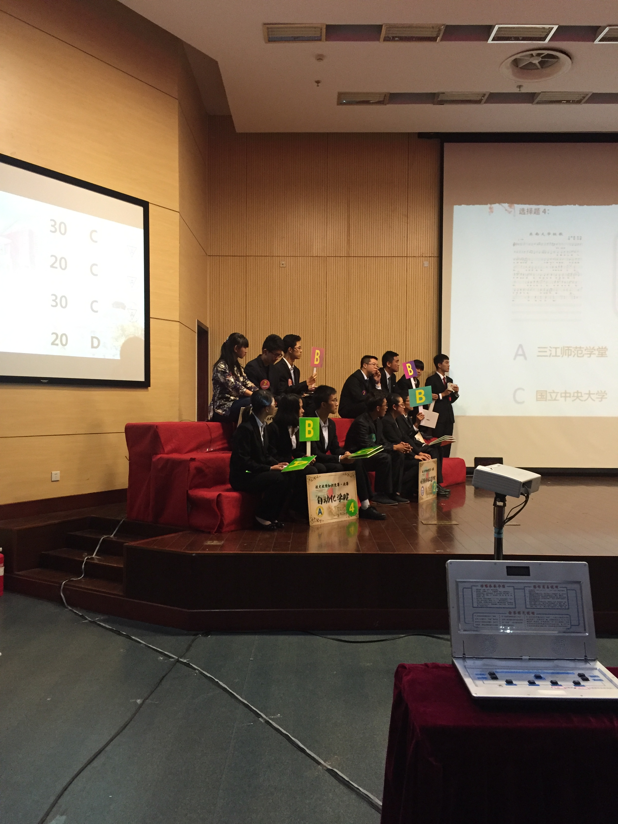 比赛分为必答题、道具题、抢答题和命题演讲四个环节,八支队伍错落有致地分坐在舞台左右两侧。必答题进行比较顺利,参赛选手们准备充分,沉着应对。道具题则是实力与运气的综合比拼,我系代表队抓住时机,表现优秀,并且幸运地获得吸取其他代表队15分的道具,这极大鼓舞了在坐的同学们。观众席上的同学们欢呼着,兴奋地敲打着手中的加油棒。抢答题更是将全场气氛推向高潮,题目以视频纠错的形式。抢答器的声音此起彼伏,气氛紧张。