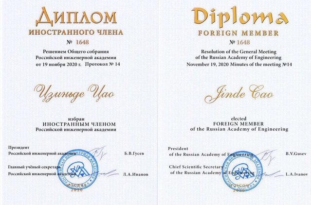 professor jinde cao, dean of the school of mathematics of southeast university, was elected a foreign member of the russian academy of engineering during the general meeting of the academy on 19 november 2020 in recognition of his outstanding contribution to the development of applied mathematics, engineering science and promoting modern technological innovations.